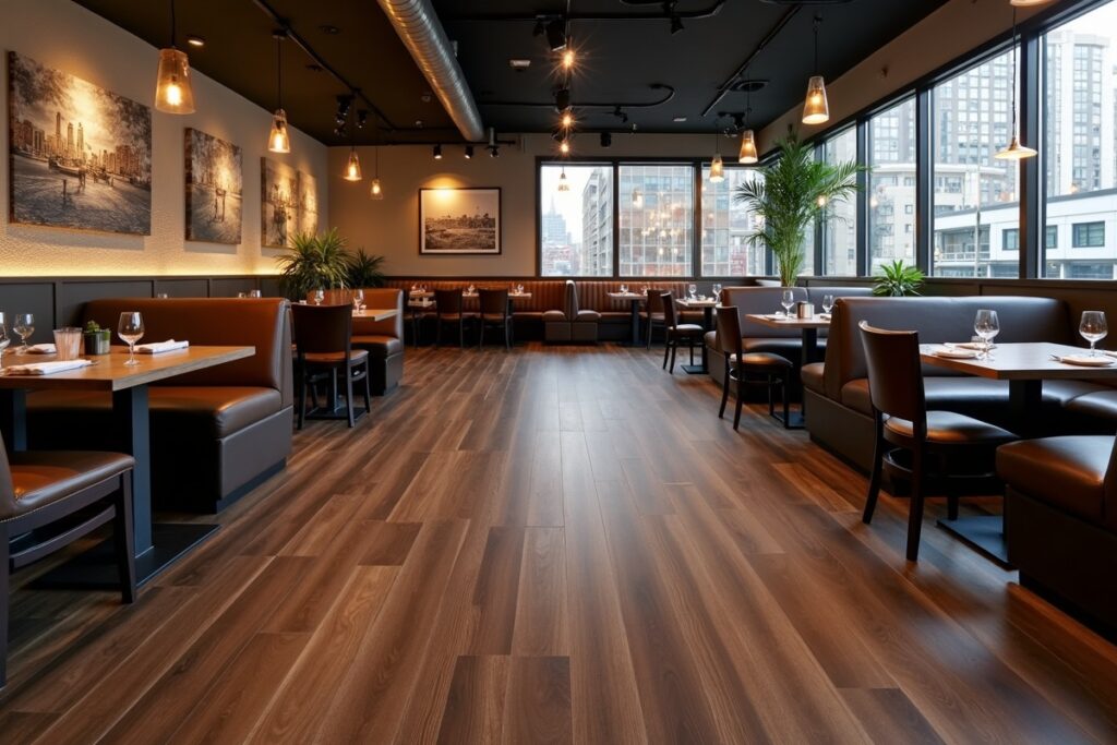 Durable flooring installation for high-traffic restaurant environment.